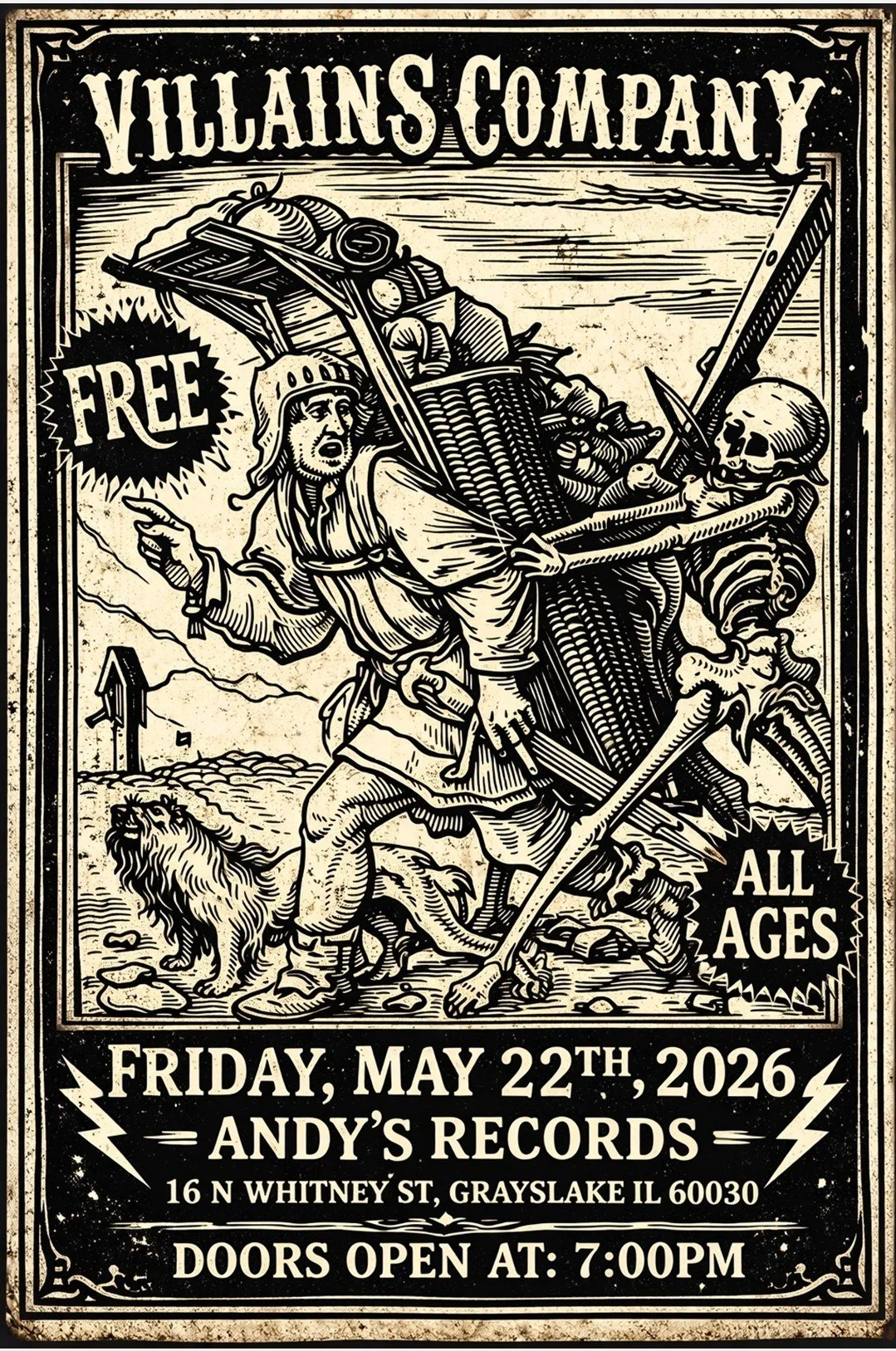 Andy's Records Live with Villains Company Friday, May 22, 2026 7:00 PM 10:00 PM Andy's Recors 16 North Whitney Street Grayslake, IL, 60030 United States (map) Google Calendar ICS Andy’s Records Live continues with Villains Company performing with support from Jason Blake. As always, all shows are FREE and ALL AGES! Doors at 7 pm, music at 7:30 pm.