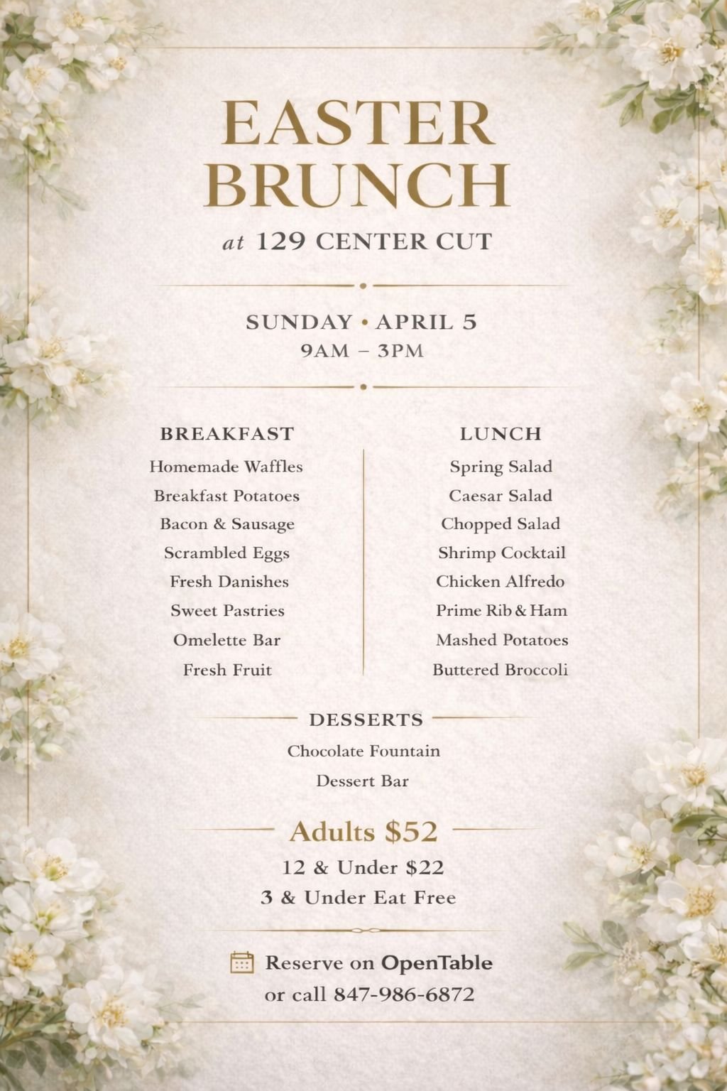 Celebrate Easter Sunday at 129 Center Cut! They’re preparing a beautiful spread of breakfast favorites, chef-carved specialties, fresh seafood, and decadent desserts to make your holiday truly special.