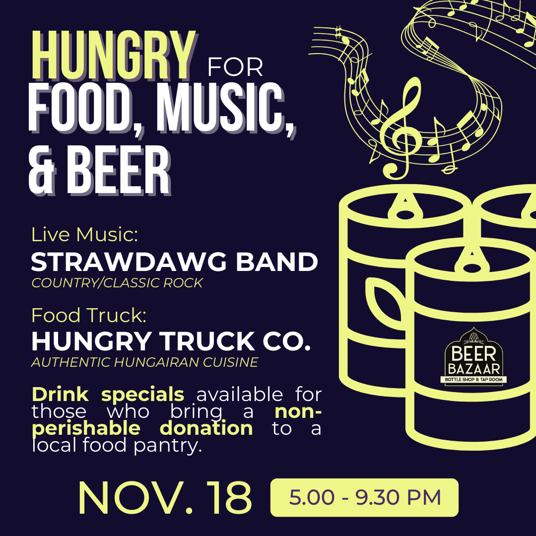 Join Beer Bazaar for tasty Hungarian comfort foods from Hungry Truck Co. and live country and classic rock music by Strawdawg Band. They will also be hosting a food drive for a local food pantry. Drink specials available to those who bring a non-perishable donation.