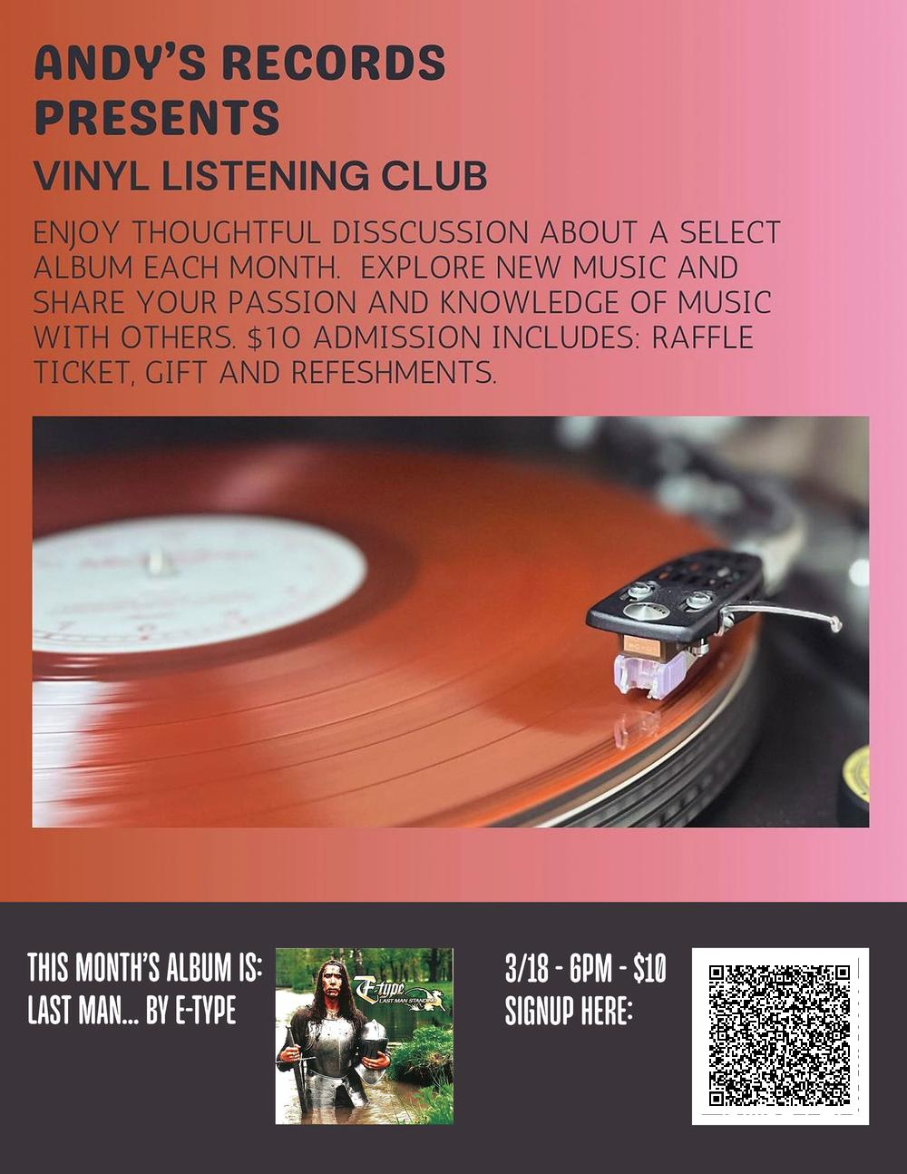 Each month, Andy’s Records will gather to listen to and dissect a selected vinyl album with a group of like-minded music lovers over snacks and drinks (BYOB). They encourage you to listen in any way you can ahead of the meeting and be prepared to participate in a casual discussion about the album. Your $10 ticket will include admission, snacks, exclusive shopping and a raffle ticket for a drawing they will do that evening (the raffle winner also gets to pick the next album if they want to!).