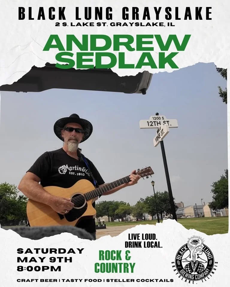 Back to All Events Live Music: Andrew Sedlak Saturday, May 9, 2026 8:00 PM 10:30 PM Black Lung Brewing Company 2 South Lake Street Grayslake, IL, 60030 United States (map) Google Calendar ICS Come out for burgers, brews, and live music from Andrew Sedlak! He’ll be playing a variety of rock and country hits!