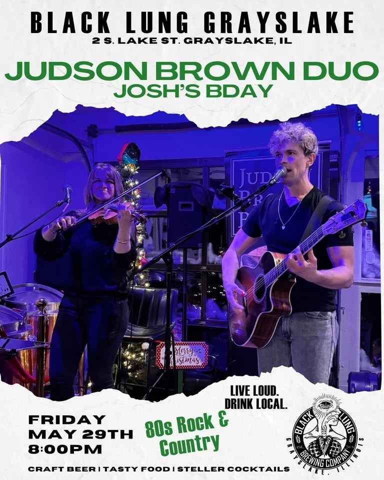 Back to All Events Live Music: Judson Brown Duo Friday, May 29, 2026 8:00 PM 10:30 PM Black Lung Brewing Company 2 South Lake Street Grayslake, IL, 60030 United States (map) Google Calendar ICS You may know Josh, one of the Black Lung Brewing’s owners. Well, it’s his birthday and Judson Brown Duo is coming to play for his big day! Join in on the fun and check out some great food, drinks, and live music!