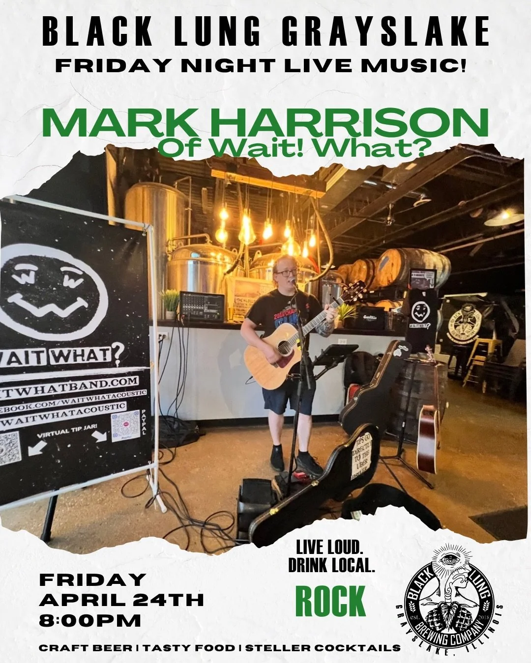 Live Music: Mark Harrison Friday, April 24, 2026 8:00 PM 10:30 PM Black Lung Brewing Company 2 South Lake Street Grayslake, IL, 60030 United States (map) Google Calendar ICS Join Black Lung Brewing for some live rock and grunge music featuring Mark Harrison of “Wait What”. Come out for some great tunes, beer and eats!