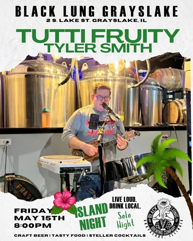 Back to All Events Live Music: Tutti Fruity Tyler Smith Island Night Friday, May 15, 2026 8:00 PM 10:30 PM Black Lung Brewing Company 2 South Lake Street Grayslake, IL, 60030 United States (map) Google Calendar ICS It’s Island Night at Black Lung Brewing Company! Come out for live music featuring Tutti Fruity Tyler Smith! 8 - 10:30 pm!