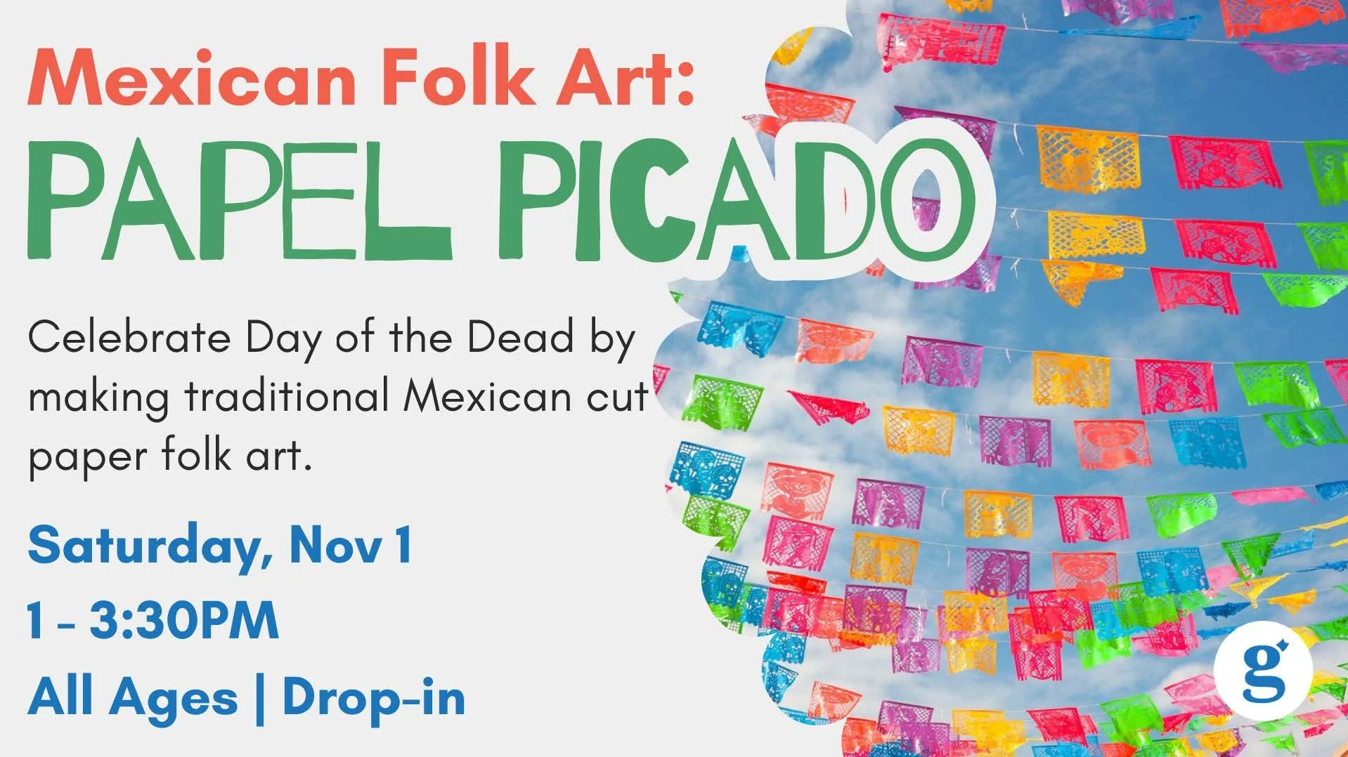 Mexican Folk Art: Papel Picado Saturday, November 1, 2025 1:30 PM 3:30 PM Grayslake Area Public Library 100 Library Lane Grayslake, IL 60030 USA (map) Google Calendar ICS Celebrate Day of the Dead by making traditional Mexican cut paper folk art - Papel Picado. Families are encouraged to work together; each family will receive supplies to make Papel Picado banners while supplies last.