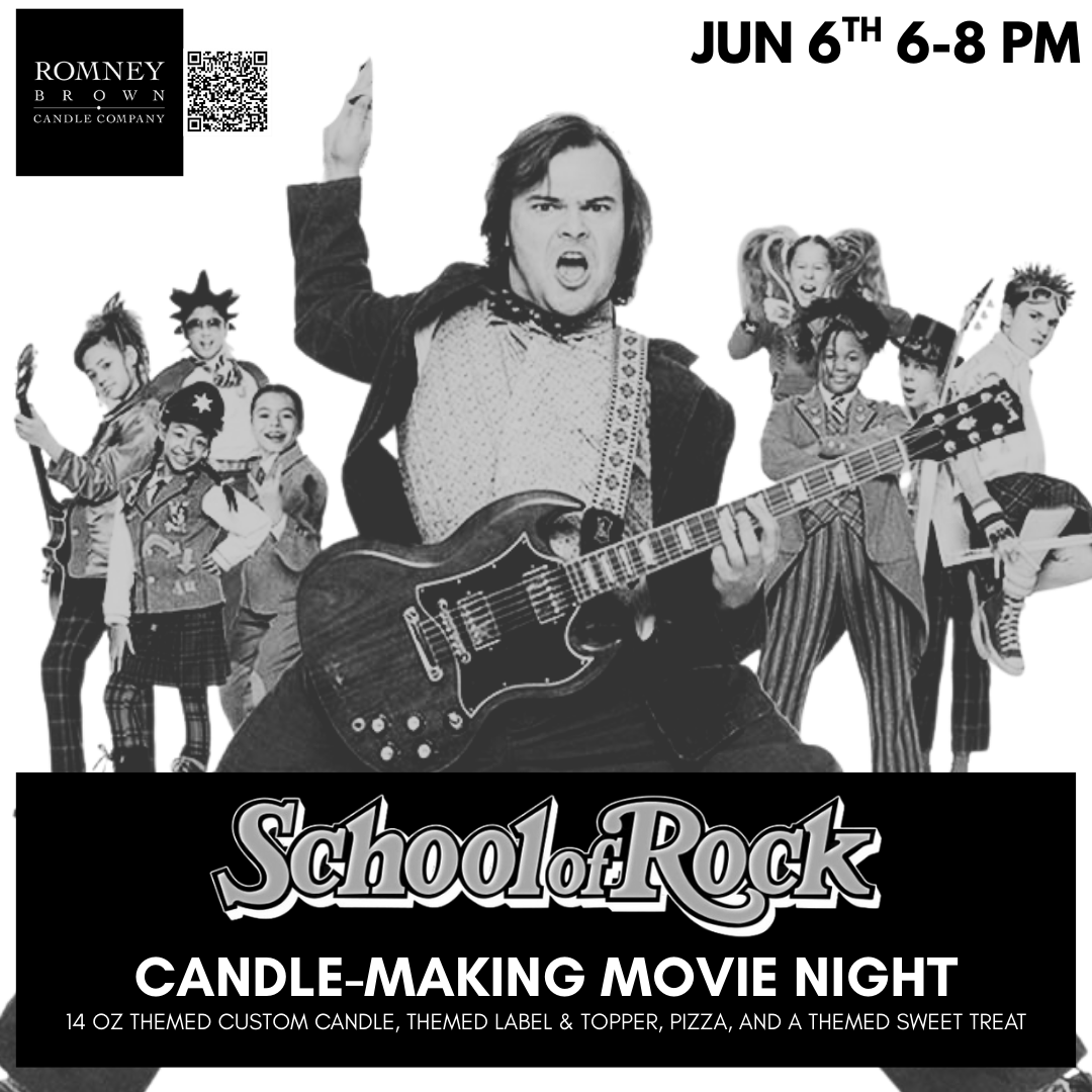 A high-energy movie night featuring School of Rock. Guests will create a custom candle while enjoying pizza, a themed dessert, and a fun, social atmosphere.