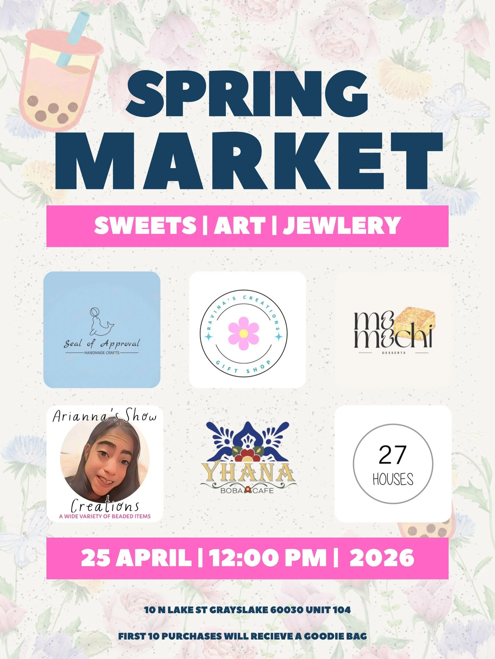 Spring Market Saturday, April 25, 2026 12:00 PM 2:00 PM Yhana Boba Cafe 10 North Lake Street Grayslake, IL, 60030 United States (map) Google Calendar ICS Come out to Yhana Boba Cafe for their Spring Market on Saturday, April 25th. They will feature sweets, arts, jewelry and more!