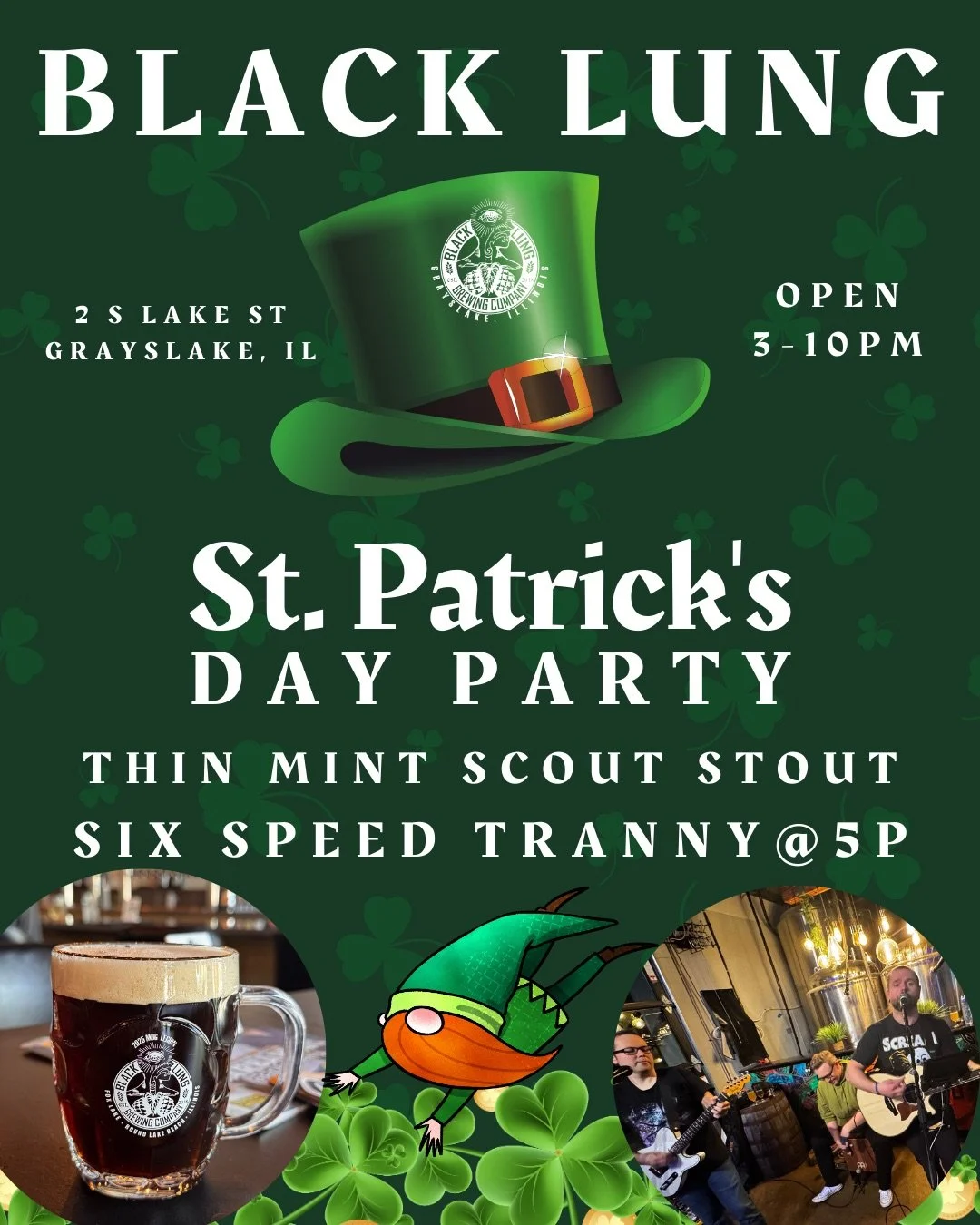Black Lung Brewing Company is excited to welcome the fellas from Six Speed Tranny beginning at 5 pm on St. Patrick’s Day!