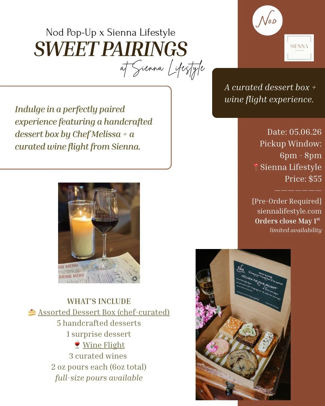 You are invited to indulge with Sweet Pairings brought to you by Nod Pop-Up x Sienna Lifestyle.