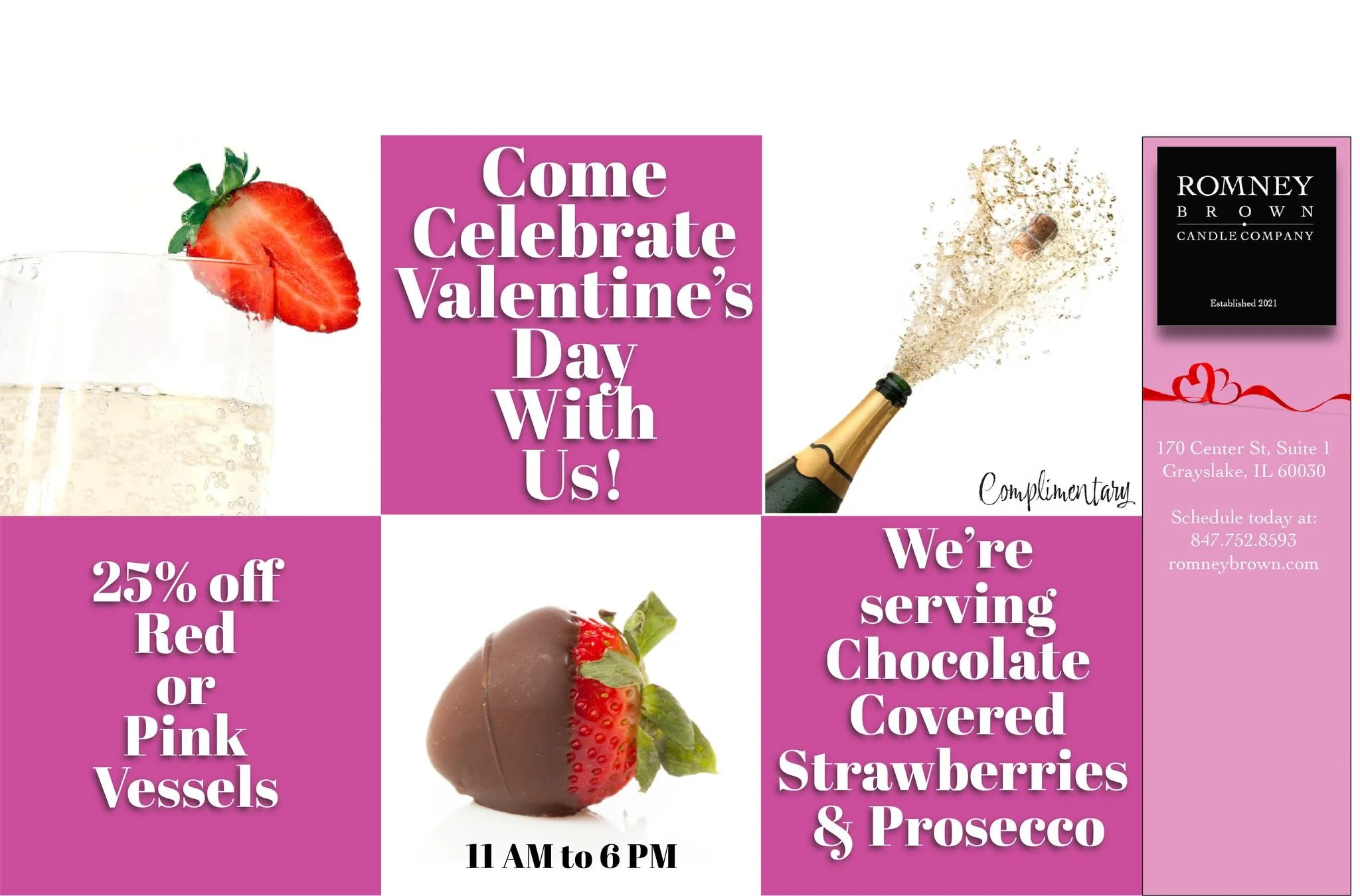 Looking for something fun to do on Valentine's Day? Come celebrate with Romney Brown Candle Company! They will have complimentary Prosecco and Chocolate Covered Strawberries all day. 25% of RED OR PINK vessels! Book your appointment by visiting Romneybrown.com.