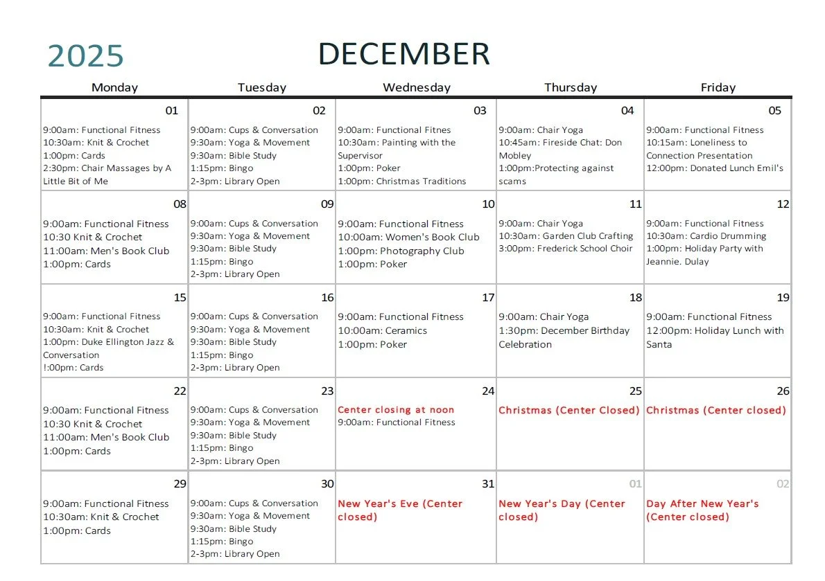 The Senior Center offers a full calendar of daily activities. Examples include: