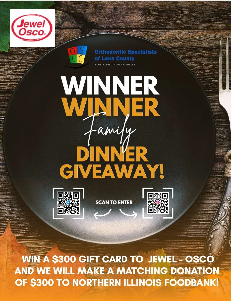 Orthodontic Specialists of Lake County are giving you the opportunity to win a $300 gift card to Jewel Osco for the holiday season. They will also donate $300 to the Northern Illinois Food Bank. Scan below to enter! Entries must be received between 11/10 - 12/10.