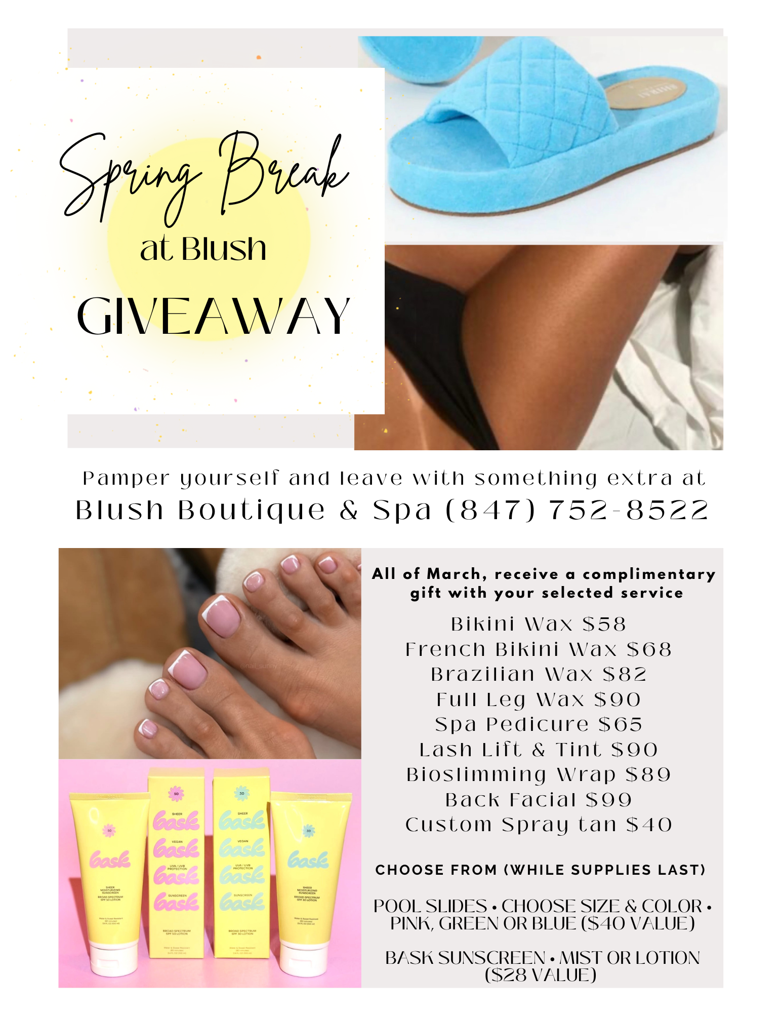 Receive your choice of a full size bottle of Bask sunscreen or a pair of pool slides when you book any of the following services during the month of March!